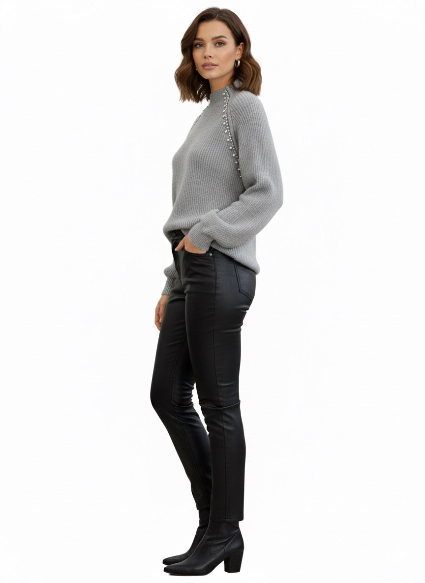 Cozy, soft Turkish knit sweater (Free Size: S-L) with a high neck, featuring sparkling rhinestone and faux pearl embroidery along the raglan shoulders. Available in Off-White, Beige, Brown, and Gray.